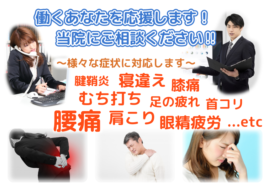 手技療法から電気療法、鍼灸治療など、外傷からボディケアまで様々な症状に対応する施術メニューを提供しています。