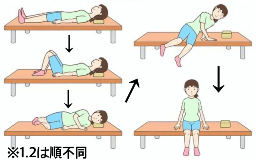 腰に負担の少ない起き方は「横向き → 腕で支える」です。