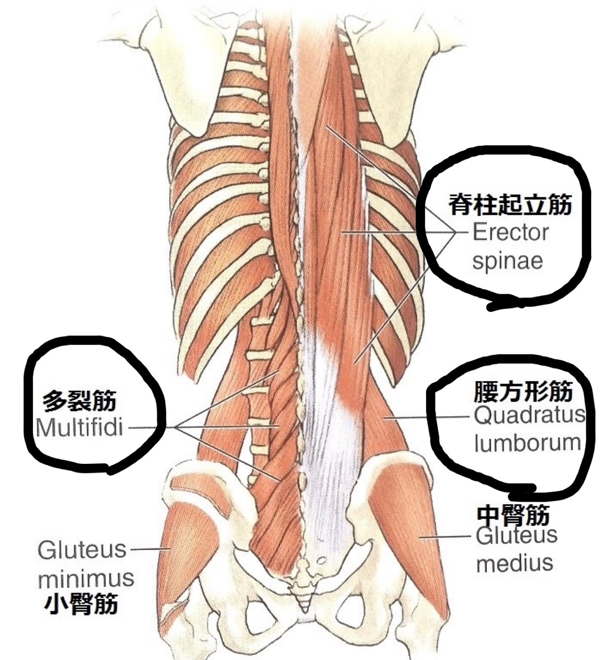 → 特に「腰方形筋」「多裂筋」「脊柱起立筋」などの深層筋が関係することが多いです。