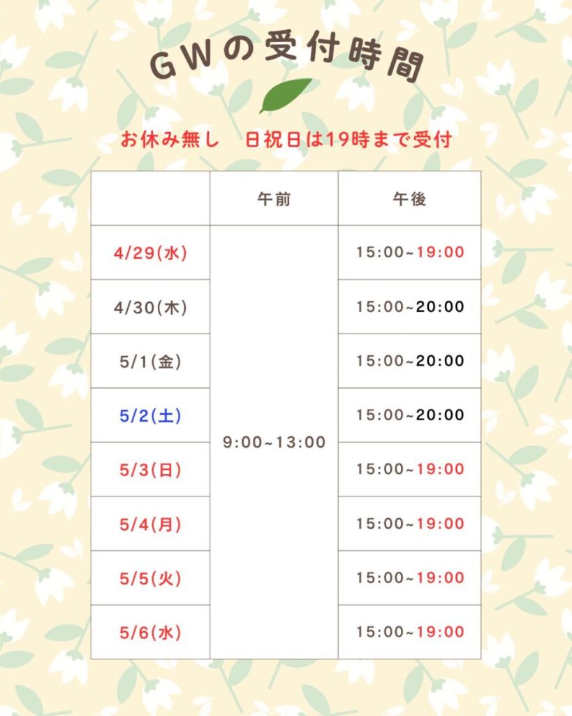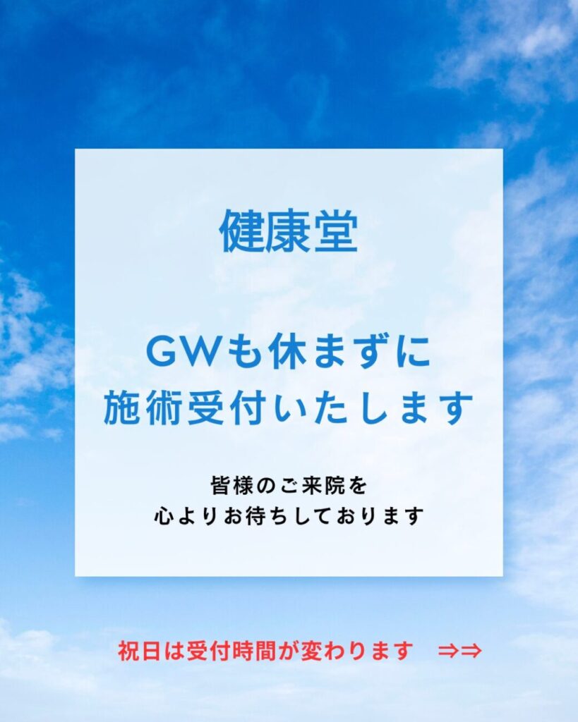 2026年4月22日 / 最終更新日時 : 2026年4月22日 健康堂接骨院・鍼灸マッサージ院 お知らせ ~GW 受付時間のお知らせ~ こんにちは!健康堂接骨鍼灸マッサージ院です! 今回はゴールデンウイークの受付時間についてお知らせします。 4月30日 5月1日、2日9:00~13:00 15:00~20:00まで4月29日 5月3日、4日、5日、6日9:00~13:00 15:00~19:00まで 日曜、祝日は午後の受付時間が19時までとなっております。 平日より1時間短縮となっておりますので、お間違えのないようご注意ください。 ◎予約方法 ネット予約はこちらから! 公式LINEから予約も可能です!!