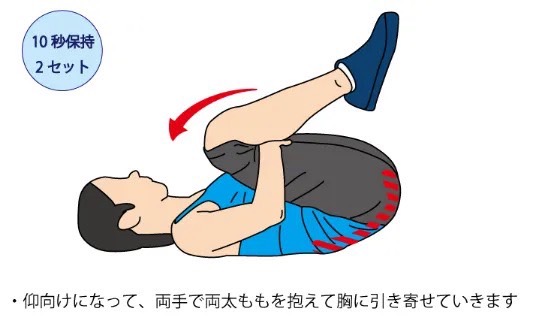 腰の張りやだるさを感じたときにおすすめなのが、「膝抱え込みストレッチ」です。