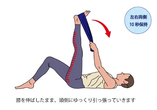 タオルを使って足を自分の方へ引き寄せながら、太ももの裏に心地よい伸びを感じる位置で10秒キープします。