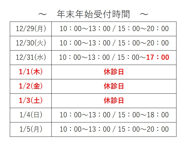 2025年12月17日 / 最終更新日時 : 2025年12月17日 プラザ接骨院 お知らせ 🎍年末12/31まで営業しております🎍 プラザ接骨院では年末年始に伴い受付時間が変更になっております。 ご来院する際には受付時間に注意して頂くよう宜しくお願い致します。