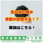 - この時期に急増!朝起きたら首が動かない…「急な首の痛み」の正体とは?こんにちは。東洋堂接骨・はり灸院です🌿 「朝起きたら首が痛くて動かない」「振り向こうとした瞬間、首にズキッと痛みが走った」「特に何もしていないのに首が回らない」 この時期、そんな “急な首の痛み” の […]